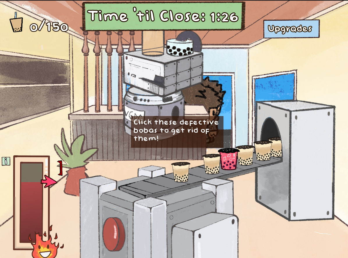- Minigame: Sometimes your machine creates defective bobas that will harm your store's reputation. Click on them to manually go in and fix them!
